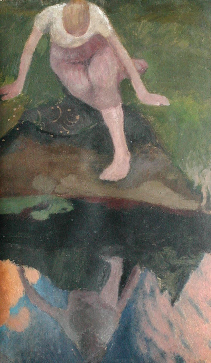L’autre tableau, en plongée, représente une jeune femme assise au bord de l’eau, une jambe pliée vers l’arrière, son torse penché vers l’avant, contemplant son reflet. La lumière colorée dans le miroir du ciel, Spiegelung (1901), fait penser aux peintres Nabis et au Talisman de Paul Sérusier, peint une dizaine d’années plus tôt. Les couleurs des nuages dorés et roses-violets dans le reflet du ciel qui porte les dernières traces du jour contrastent avec la gamme de couleurs terreuses du rivage. La silhouette, dont on ne voit le visage ni d’en haut, ni d’en bas, est éclairée par l’eau. Dans cette atmosphère onirique et douce, de petites taches claires sur la pierre ou la terre près des jambes reliées par des traits courbes frôlent la dimension décorative d’une peinture symbolique.