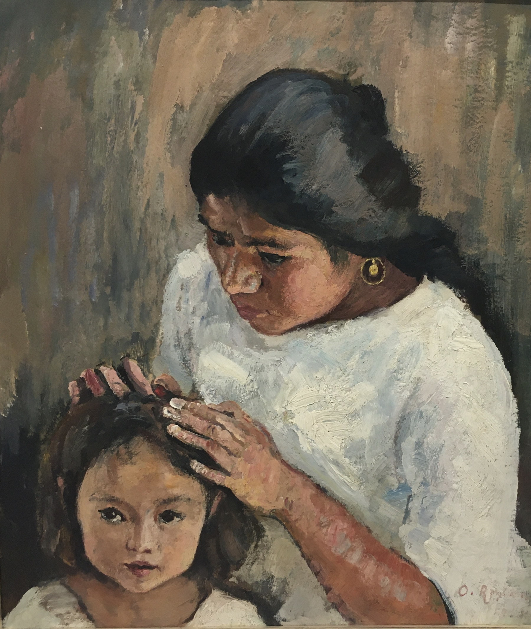 Au Mexique, elle passe des semaines seule dans les montagnes, dont l’extrême beauté la sauve régulièrement de doutes existentiels qu’elle confie à Hedwig Woermann dans ses lettres. Elle se demande si elle ne manque pas sa vie, si elle arrivera à tenir les promesses si claires de l’enfance. Elle peint ce qu’elle voit dehors, dans la rue, dans des couleurs de plus en plus vives ; elle fait de nombreux portraits de Bodzio et des personnes qu’elle rencontre. Le motif de la mère à l’enfant, si souvent peint par Paula Modersohn-Becker, est récurrent chez elle aussi. Les trois autoportraits placés au centre de l’exposition d’Ottilie Reylaender « Libre et indépendante » à Worpswede sont flanqués de toiles représentant des femmes avec leurs petits : une mère allaitant, entièrement concentrée sur son nourrisson, peinte autour de 1900 ; une femme mexicaine, le regard perdu au loin, berçant et veillant un enfant endormi dans son hamac, emmitouflé dans une couverture à carreaux (1927) ; une autre femme à la chevelure d’un noir brillant, vêtue de blanc, en train d’épouiller la tête d’une petite fille qui, patiente, nous regarde à travers celle qui la peint (1926). Ces scènes de tendresse sont aussi des témoignages d’une temporalité propre à la maternité et propice au temps de pose : le temps de la nourriture, du sommeil, des soins corporels qui requièrent une présence immobile et attentive, rythmée par les besoins de l’enfant.