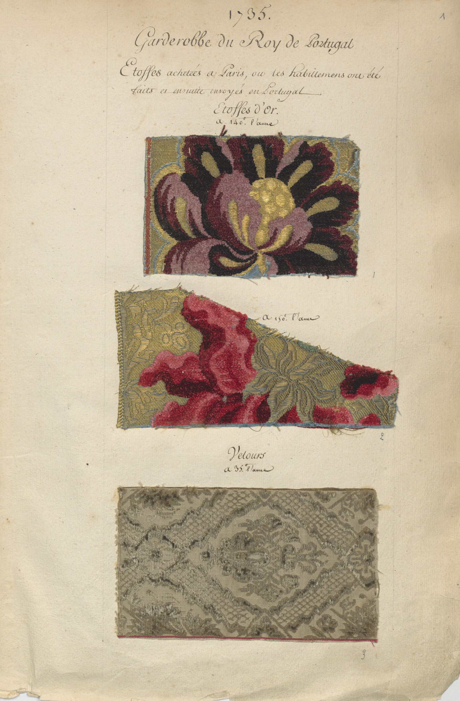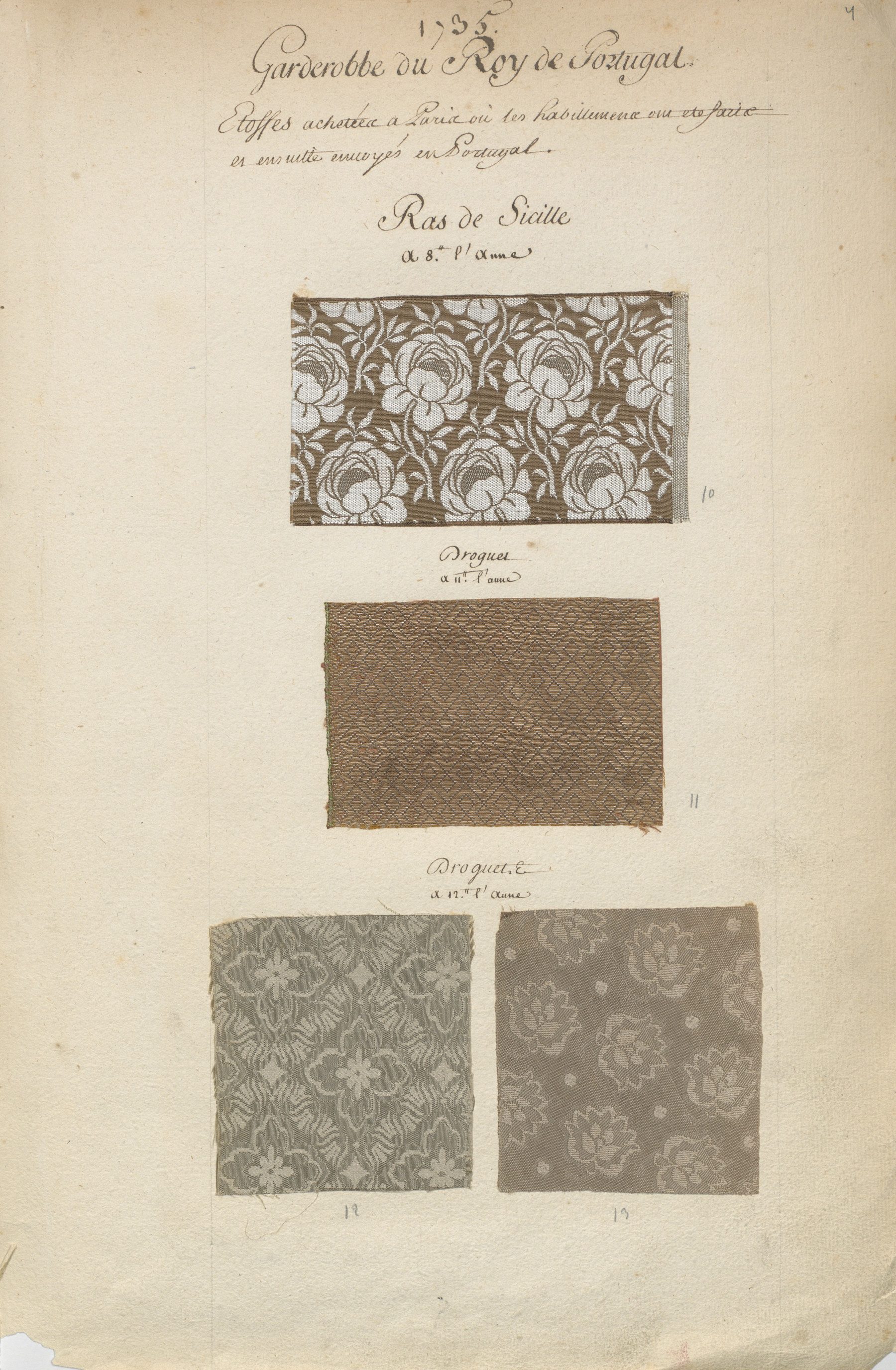 Les productions des soieries lyonnaises et des toiles imprimées dans les manufactures françaises montrent que les mêmes motifs floraux, naturalistes ou stylisés, sont employés pour décorer les intérieurs et pour confectionner les garde-robes. L’échelle des motifs et l’épaisseur des soieries permettent de distinguer la finalité du décor, mais les échantillons commandés pour la garde-robe du roi du Portugal, réalisée à Paris en 1735, prouvent que ces critères ne sont pas suffisants1515« 1735. Garderobbe du Roy du Portugal. Etoffes achetées à Paris où tous les habillemens ont été faits et ensuitte envoyés au Portugal », in Album d’échantillons d’étoffes et toiles des manufactures de France, recueillis par le Maréchal de Richelieu, t. 1, 1735-1736, p. 1-4. Bibliothèque nationale de France, LH-45-Boîte fol.. Les velours, qui forment les principales étoffes achetées, présentent des décors de grenades et d’ornements répandus dans les ameublements, seuls les étoffes de soie dites « droguets » avec leurs petits motifs stylisés sont fabriqués spécialement pour la confection des habits [fig. 3] [fig. 4]. Les fabricants ont donc progressivement introduit au XVIIIe siècle une spécialisation dans l’usage des décors, annonçant une séparation stricte dans l’industrie textile au XIXe siècle.