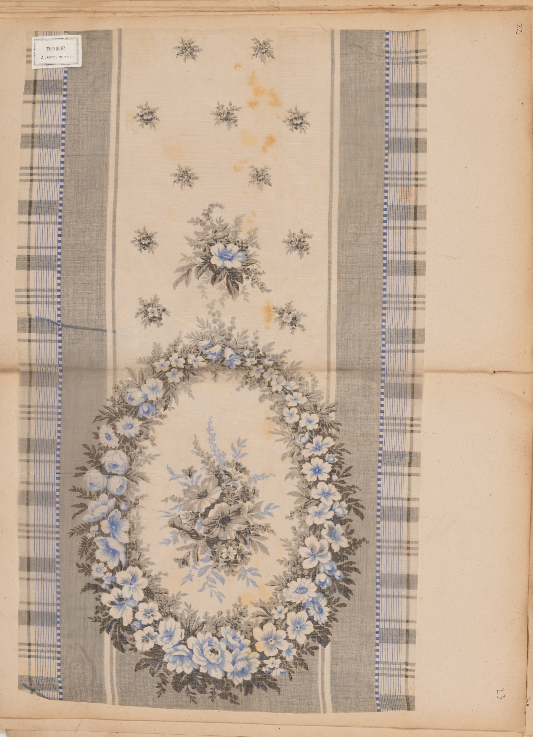 Le naturalisme des fleurs, déjà répandu au XVIIIe siècle, est un moyen pour les manufactures de se distinguer dans un marché fortement concurrentiel. Le motif floral forme un vocabulaire décoratif qui unie les usages des tissus tandis que la matière — coton ou soierie — et les types de fabrications — percale ou jaconas — différencient leurs usages pour la robe ou les rideaux. Le même phénomène est visible dans l’impression sur laine — fine pour les robes d’intérieur ou épaisse pour les meubles — comme celles produites par la manufacture de Thierry-Mieg & Compagnie qui développent des sergés de laine dit « lastings ». Ce type d’étoffes de laine, réservées à l’ameublement, sont décorées de grands bouquets fleuris sur fond écru ou noir, esthétiquement proches de ceux imprimés dans les tissus pour la mode, même si souvent l’échelle varie.