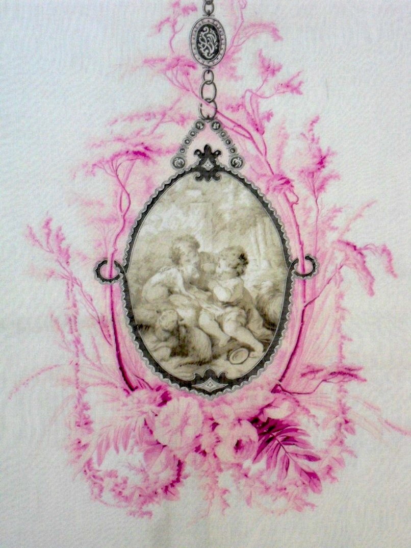 La comparaison entre des échantillons correspondant aux deux usages témoigne d’une unité stylistique autour du modèle floral. Des impressions sur jaconas — une très fine toile de coton — appréciées pour les toilettes d’après-midi et la confection de crinolines légères de la manufacture Hofer-Grojean à Mulhouse, datant de 1867, présentent des compositions de bouquets et de motifs en rayures qui les différencient peu des motifs répandus dans les toiles imprimées pour les ameublements [fig. 5]. Les similitudes de coloris s’expliquent par l’essor de la chimie qui profite à toutes les entreprises d’impressions quel que soit les supports imprimés. Souvent les compositions pour la robe se composent de motifs en bandes qui peuvent être assemblées pour former les crinolines, influençant l’organisation des décors en bouquet [fig. 6]. L’analogie avec le monde décoratif de l’ameublement prend parfois des dimensions inattendues lorsque le dessin inclut la figure, habituellement réservée à l’ameublement sur le modèle des tapisseries et des peintures. Un échantillon imprimé pour la robe présente une composition florale en bouquet qui encadre un médaillon formant un bijou en trompe-l’œil, procédé décoratif très répandu, sauf que dans cet exemple, il sert de cadre à une scène en grisaille évoquant des amours dans le style de Fragonard [fig. 7]. Ce genre de motifs figuratifs, très en vogue sous le Second Empire et commercialisés sous le nom de « dessin Pompadour » en référence à la favorite de Louis XV, est habituellement employé pour le décor des chambres. À l’inverse, des toiles pour ameublement empruntent des effets visuels très répandus dans les tissus de haute nouveauté en imitant les différentes armures des étoffes pour crinoline qui alternent en bande des effets dus au tissage et l’impression de motifs. Le fond n’est pas mis en forme dans une robe, mais sert de contrefond au décor du mur sur lequel les bouquets fleuris se détachent. Ces quelques exemples montrent que la division des secteurs textiles n’empêche pas les motifs de se diffuser et de s’adapter en particulier lorsqu’il s’agit de décors floraux, la différence étant visible dans le support du tissu.